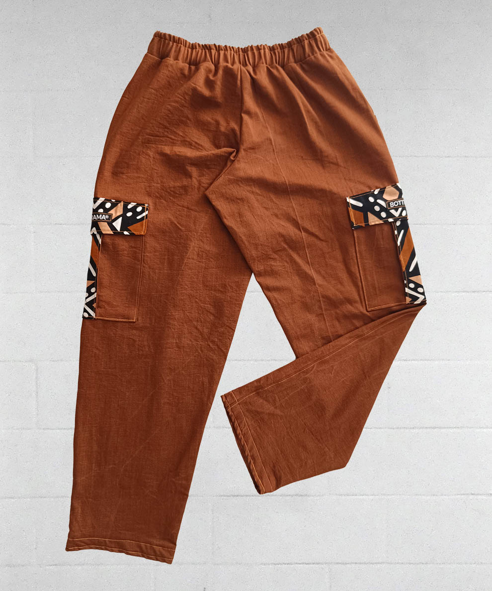 Slow Fashion Streetwear & Dancewear: pantaloni cargo in denim ruggine realizzati a mano con inserti in vero tessuto Wax prodotto in Senegal.